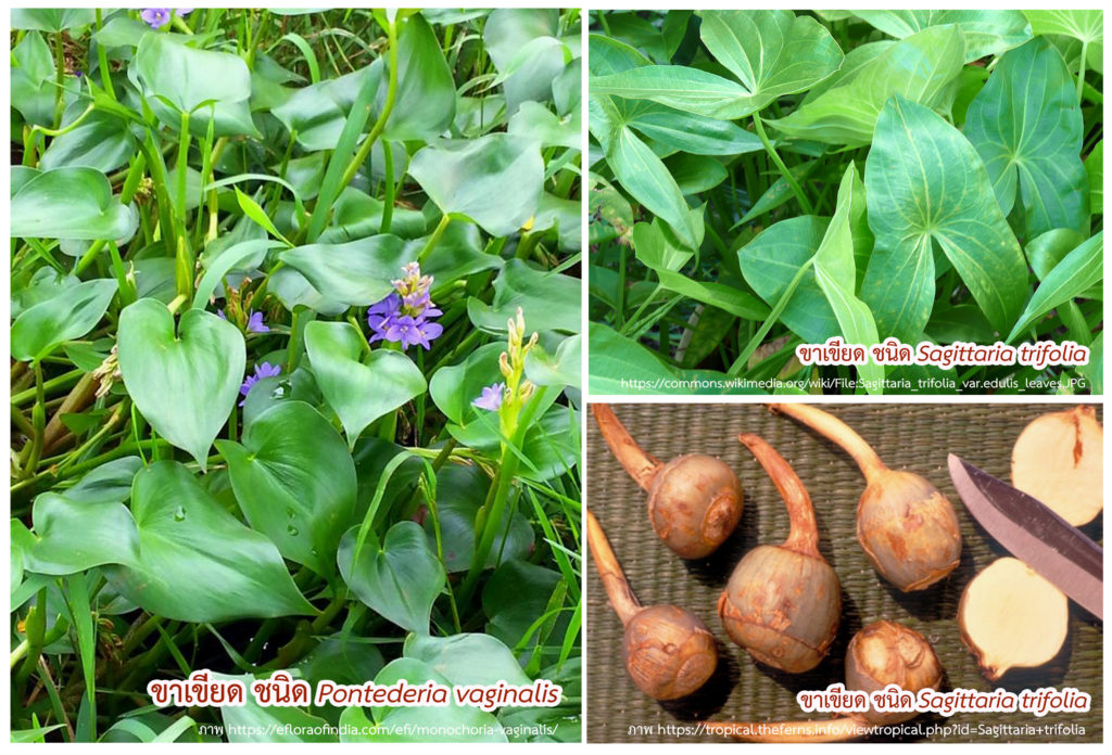 ขาเขียด ที่ไม่ใช่มาจากตัวเขียด กบ แต่เป็นชื่อของไม้น้ำนั้น ข้อมูลจากหอพรรณไม้ กรมป่าไม้ พบว่าในเมืองไทยมี 2 ชนิด คือ 1) Sagittaria trifolia L.และ 2) Pontederia vaginalis Burm.f. (ชนิดนี้เดิมมีชื่อวิทยาศาสตร์ว่า Monochoria vaginalis (Burm.f.) C.Presl ex Kunth)